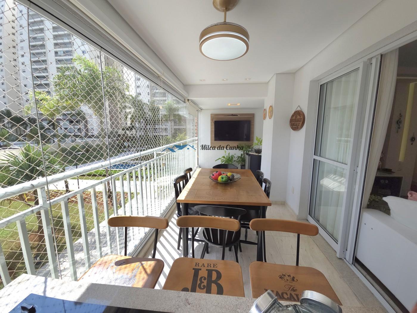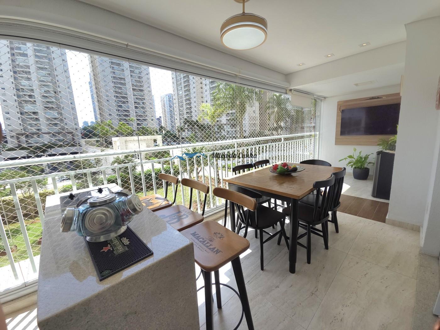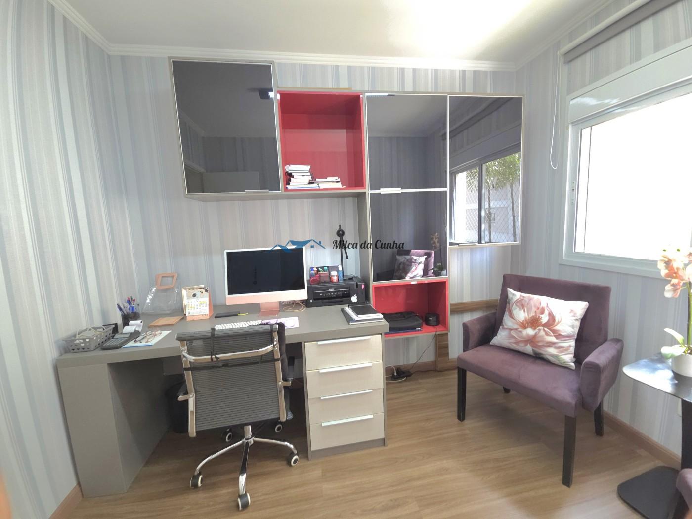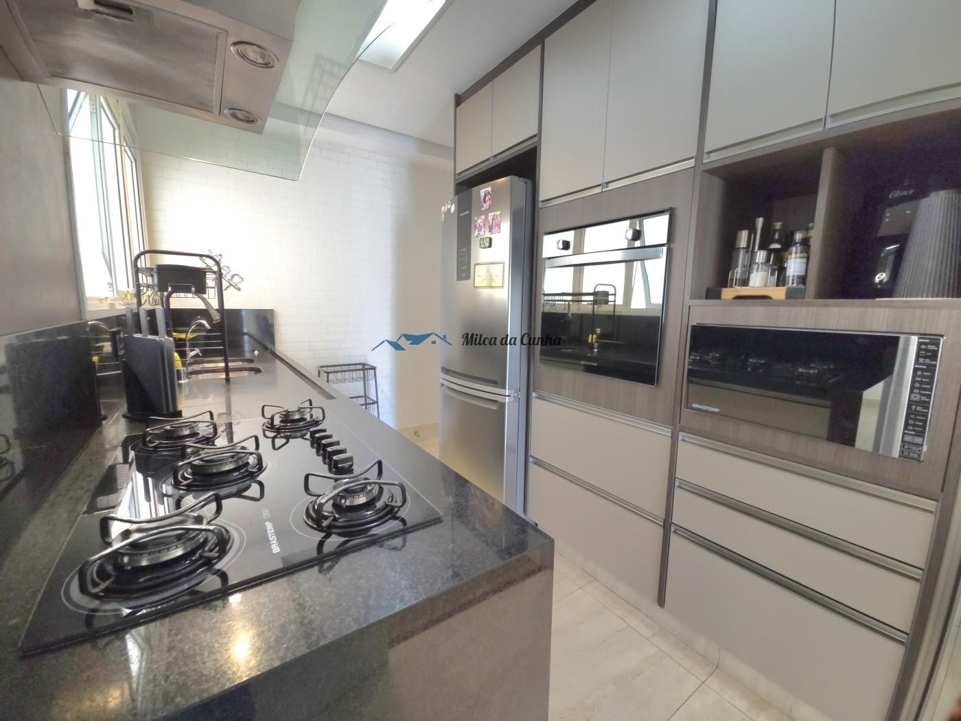 São 133 metros quadrados resolvidos com inteligência: o escritório isola o trabalho do descanso, enquanto o closet e os móveis planejados eliminam qualquer preocupação com reforma ou marcenaria imediata. A cozinha já está pronta para o uso, integrada a uma sala que flui naturalmente para a sacada com churrasqueira. É o tipo de planta que acomoda desde o jantar reservado até o movimento constante das crianças, tudo com o suporte de uma fechadura digital nas duas portas, vagas cobertas que facilitam a logística diária.