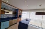 O piso da sacada é de cimento queimado, a pedra da pia e da bancada é de quartzo ocean blue, possui painel de madeira de demolição atras do sofá e a churrasqueira é revestida com tijolinho Brick.