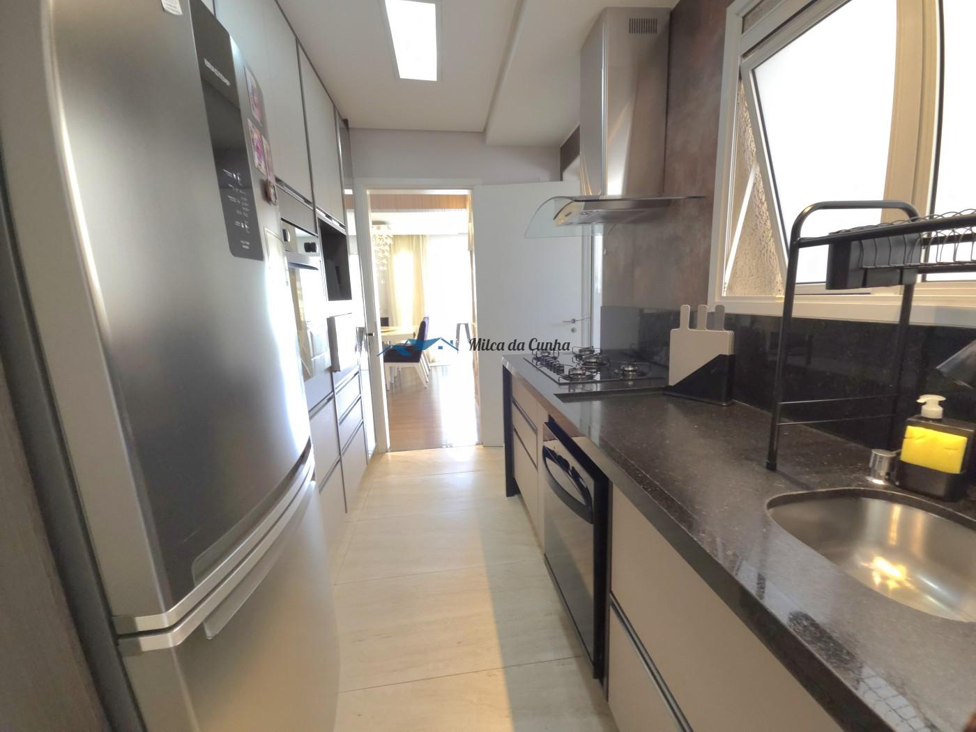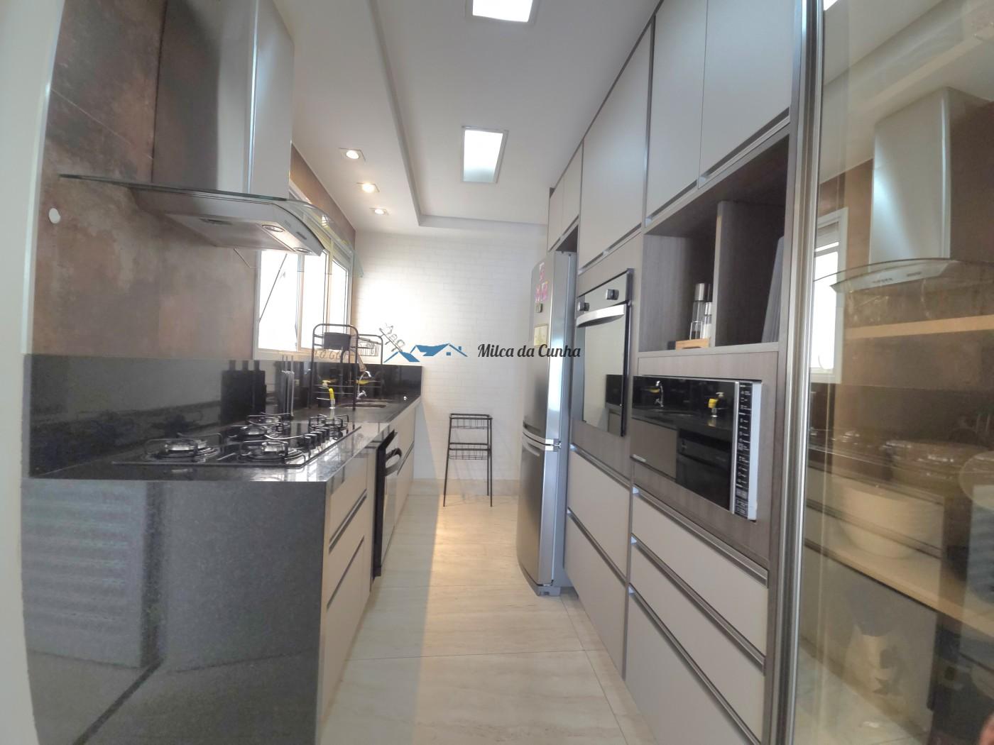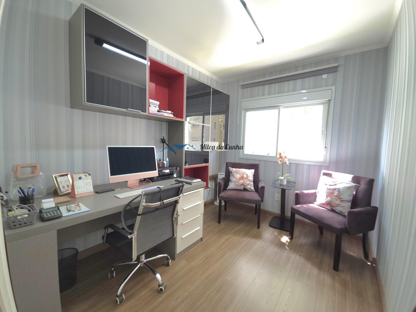 São 133 metros quadrados resolvidos com inteligência: o escritório isola o trabalho do descanso, enquanto o closet e os móveis planejados eliminam qualquer preocupação com reforma ou marcenaria imediata. A cozinha já está pronta para o uso, integrada a uma sala que flui naturalmente para a sacada com churrasqueira. É o tipo de planta que acomoda desde o jantar reservado até o movimento constante das crianças, tudo com o suporte de uma fechadura digital nas duas portas, vagas cobertas que facilitam a logística diária.