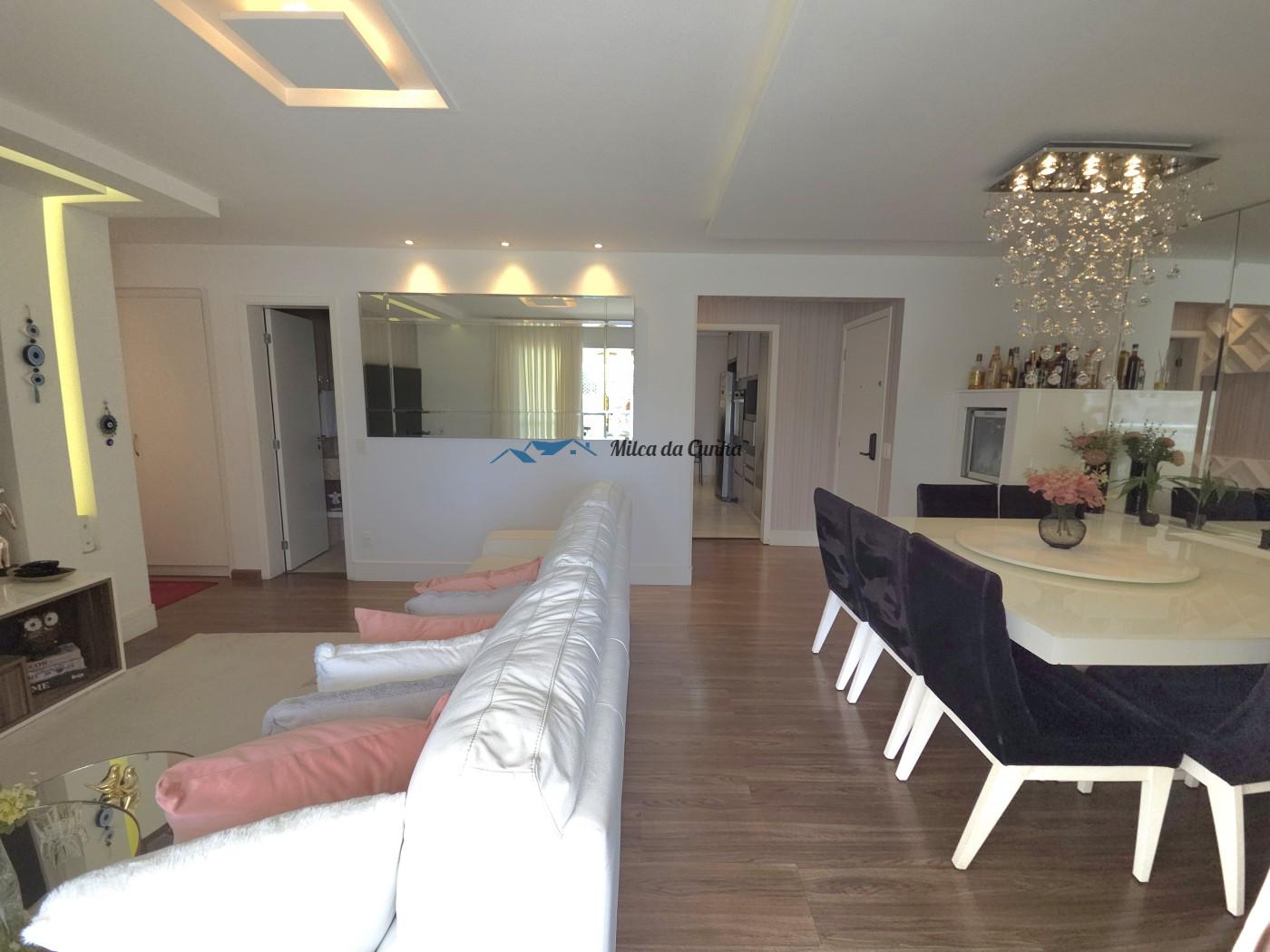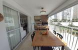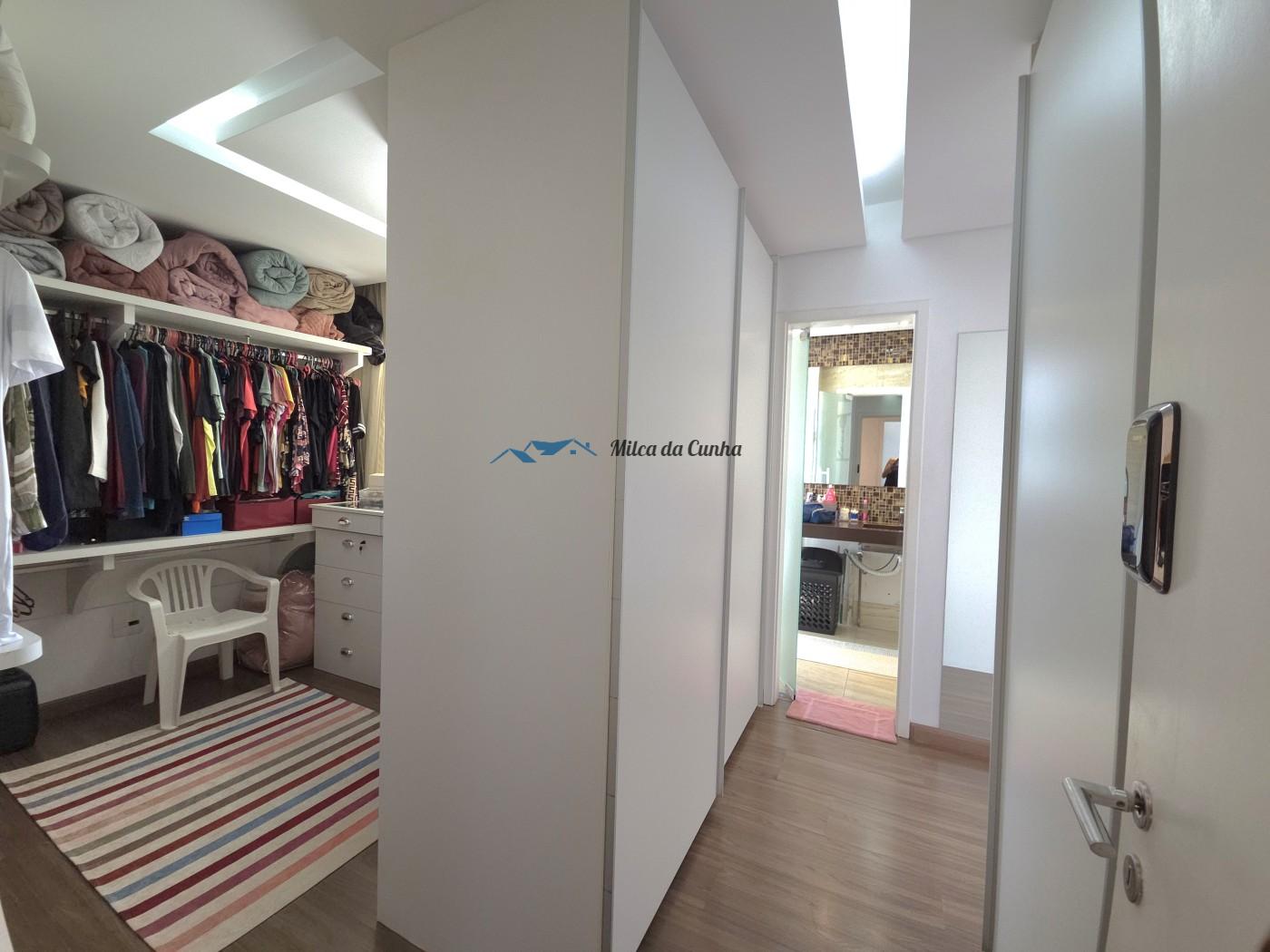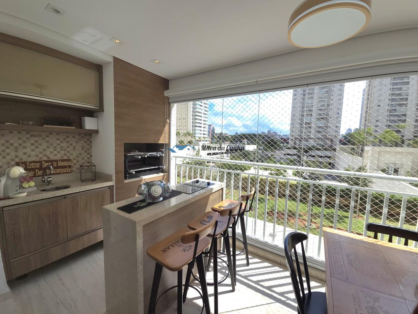 São 133 metros quadrados resolvidos com inteligência: o escritório isola o trabalho do descanso, enquanto o closet e os móveis planejados eliminam qualquer preocupação com reforma ou marcenaria imediata. A cozinha já está pronta para o uso, integrada a uma sala que flui naturalmente para a sacada com churrasqueira. É o tipo de planta que acomoda desde o jantar reservado até o movimento constante das crianças, tudo com o suporte de uma fechadura digital nas duas portas, vagas cobertas que facilitam a logística diária.