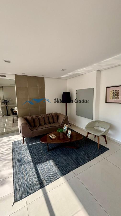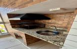 É difícil encontrar uma churrasqueira a carvão instalada na varanda em plantas de 85 metros quadrados, mas no Ville Dumont esse é o ponto de partida. O apartamento resolve a vida de quem não abre mão do churrasco de domingo e precisa de espaço real para a família. São três dormitórios, sendo uma suíte, com uma distribuição que separa bem a área íntima do convívio social. A cozinha americana integrada amplia o olhar e conecta com a sala, enquanto a lavanderia independente mantém a organização do dia a dia longe das visitas. Você entra e percebe que a marcenaria planejada na cozinha, nos banheiros e na suíte já antecipa um investimento alto que você não precisará fazer. O piso alterna entre porcelanato e cerâmica, unindo estética e praticidade de limpeza em um andar alto com vista livre.